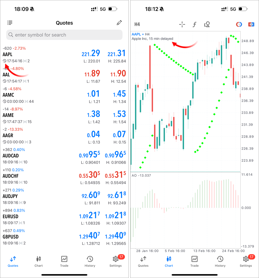 5. 如果交易工具使用了延迟,则改进报价延迟指示。此信息现在显示在图表上,同时“市场报价”部分的图标变得更加突出。